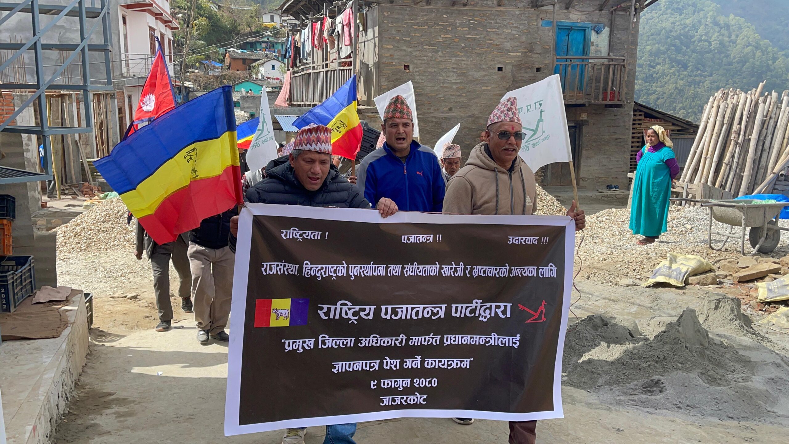 जाजरकोट । राष्ट्रिय प्रजातन्त्र पार्टी (राप्रपा) जाजरकोटले पार्टीको केन्द्रीय निर्देशन बमोजिम जिल्ला प्रसासन कार्यालयमा पुगेर ज्ञापन पत्र वुझाएको छ । ज्ञापन पत्र बुझाउनुअघि जाजरकोट जिल्लाको ठाँटीबजारबाट दबाबमूलक र्याली सुरु गरेर गैरीखाली बजार हुदै जिल्ला प्रशासन कार्यालयमा पुगेर प्रमुख जिल्ला अधिकारीलाइ ज्ञापन पत्र बुझाएको पार्टीका अध्यक्ष कृष्ण विक्रम शाहले जानकारी दिए ।