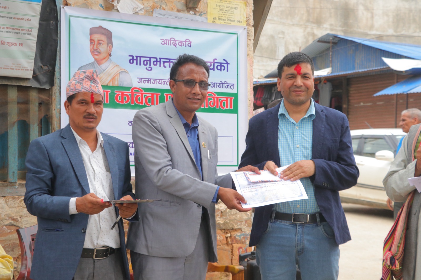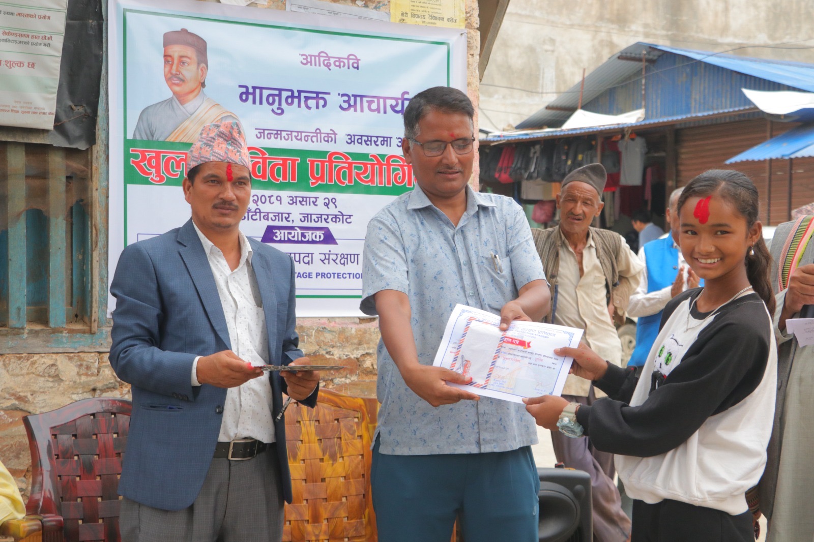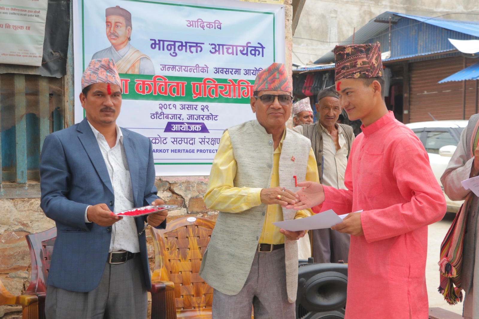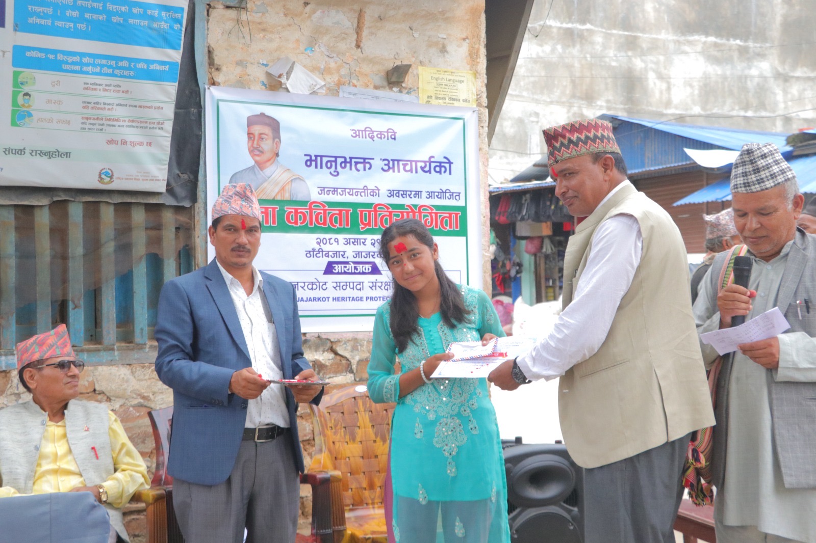 विजयीहरुलाइ वारेकोट गाउँपालिकाका अध्यक्ष वीरवहादुर गिरी, जाजरकोटका अग्रज साहित्यकार हरि सन्दर्भ, जिल्ला समन्वय समितिका सदस्य चित्रप्रसाद शर्मा र स्थानीय समाजसेवी दिवाकर शर्माले पुरस्कार तथा प्रमाणपत्र वितरण गरे । भेरी नगरपालिका वडा नम्वर ३ ठाँटीवजारको वरको चौतारीमा भएको कार्यक्रममा जिल्ला स्थिति विभिन्न सरोकारवालाहरु, प्रतिष्ठानका सदस्यहरु, पत्रकारहरु, शिक्षक विद्यार्थीहरु, साहित्यीक स्रष्टाहरु र स्थानीय सर्वसाधारणहरुको उल्ल्ोख्य सहाभगिता रहेको थियो ।