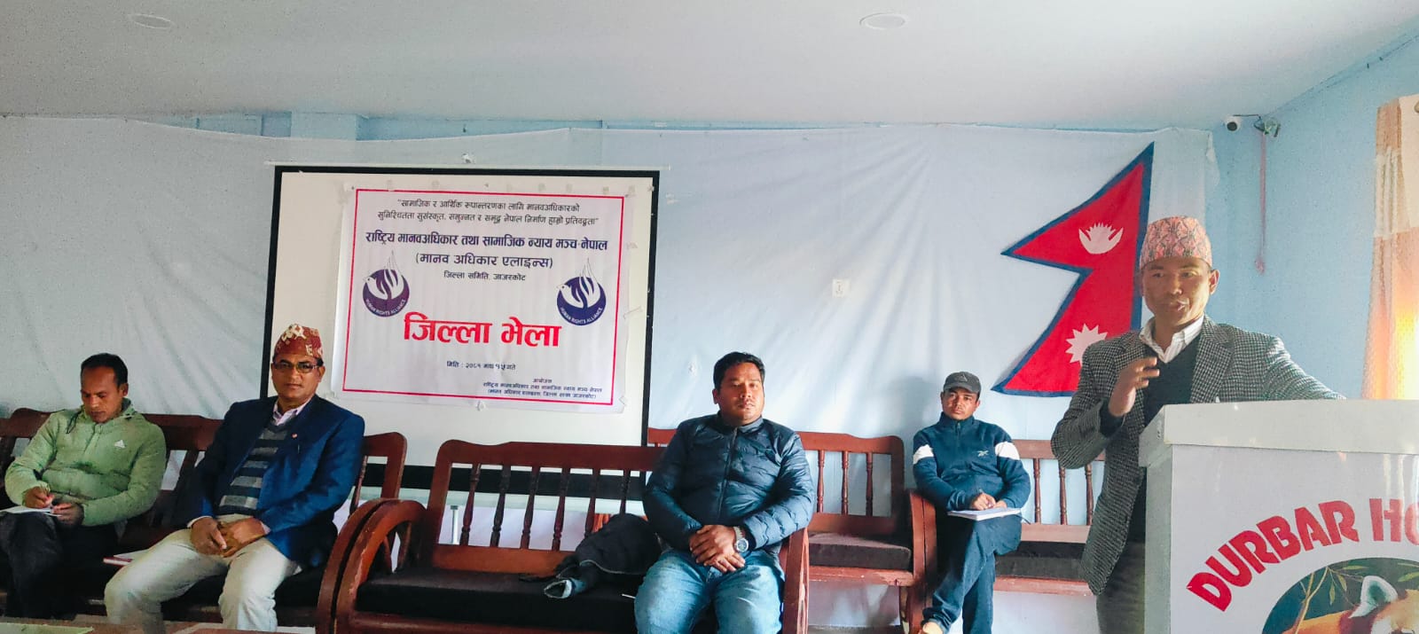 जाजरकोट । राष्ट्रिय मानवअधिकार तथा सामाजिक न्याय मञ्च-नेपाल (मानव अधिकार एलाइन्स) जिल्ला शाखा जाजरकोटले आयोजना गरेको जिल्ला भेलामा नेकपा एमालेका केन्द्रीय सदस्य तथा भेरी नगरपालिकाका नगरप्रमुख चन्द्रप्रकाश घर्तीले मानव अधिकारको महत्व र सामाजिक न्यायका विषयमा जोड दिनुभएको छ।